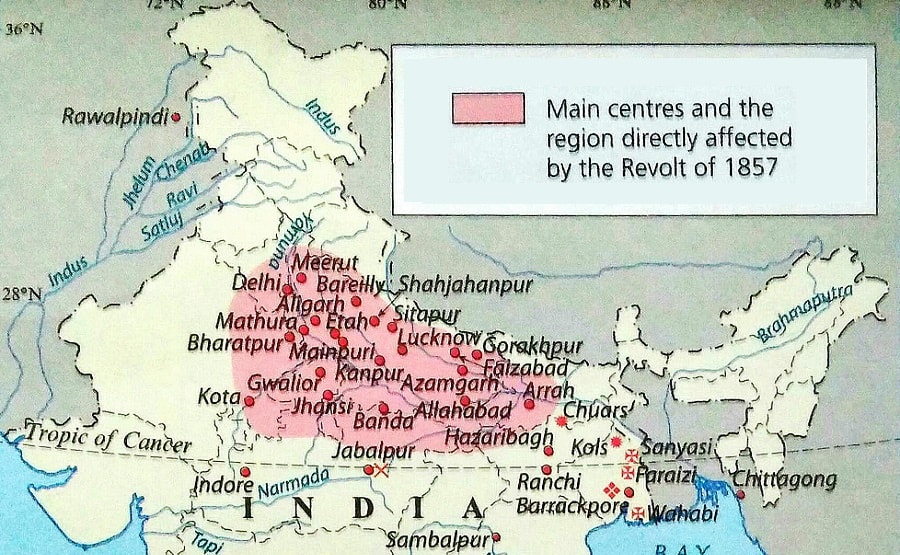 - Awadh, Rohilkhand, Doab, Bundelkhand, central India, large parts of Bihar and East Punjab shook off British authority.